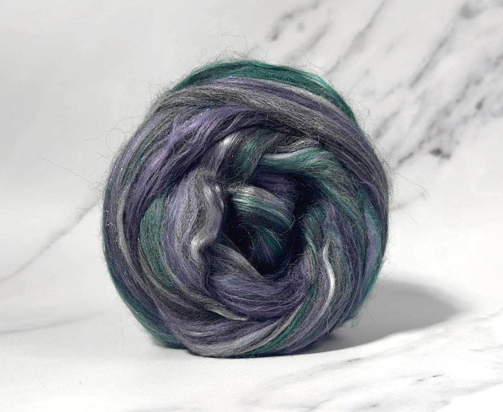 A dark sparkly blend, I absolutely love it! 60% bamboo for the ultimate drape, 30% Corriedale and 10% Stellina for an unforgettable sparkle. 100g