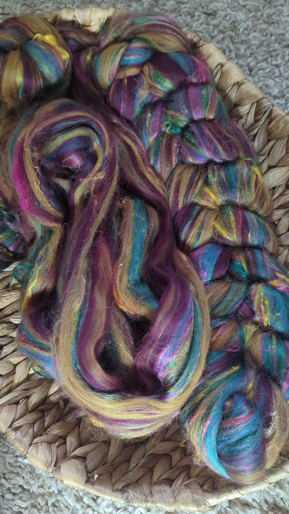 A Chaotic Custom Blend of 64% Merino 12% each Tussah Silk, Bamboo and Sari Silk. I love choosing fibres to blend together, I hope you enjoy! 100g