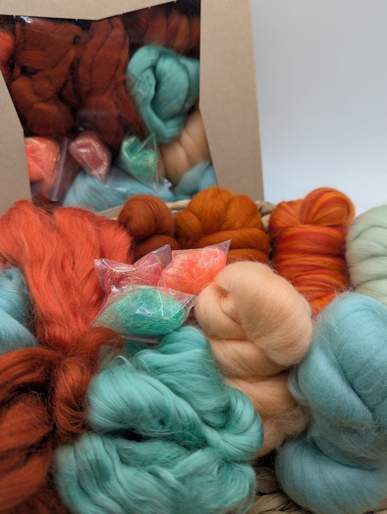 A variety of Fibres in an Orange colour palette with hints of Mint Green and Sparkle! 213g total